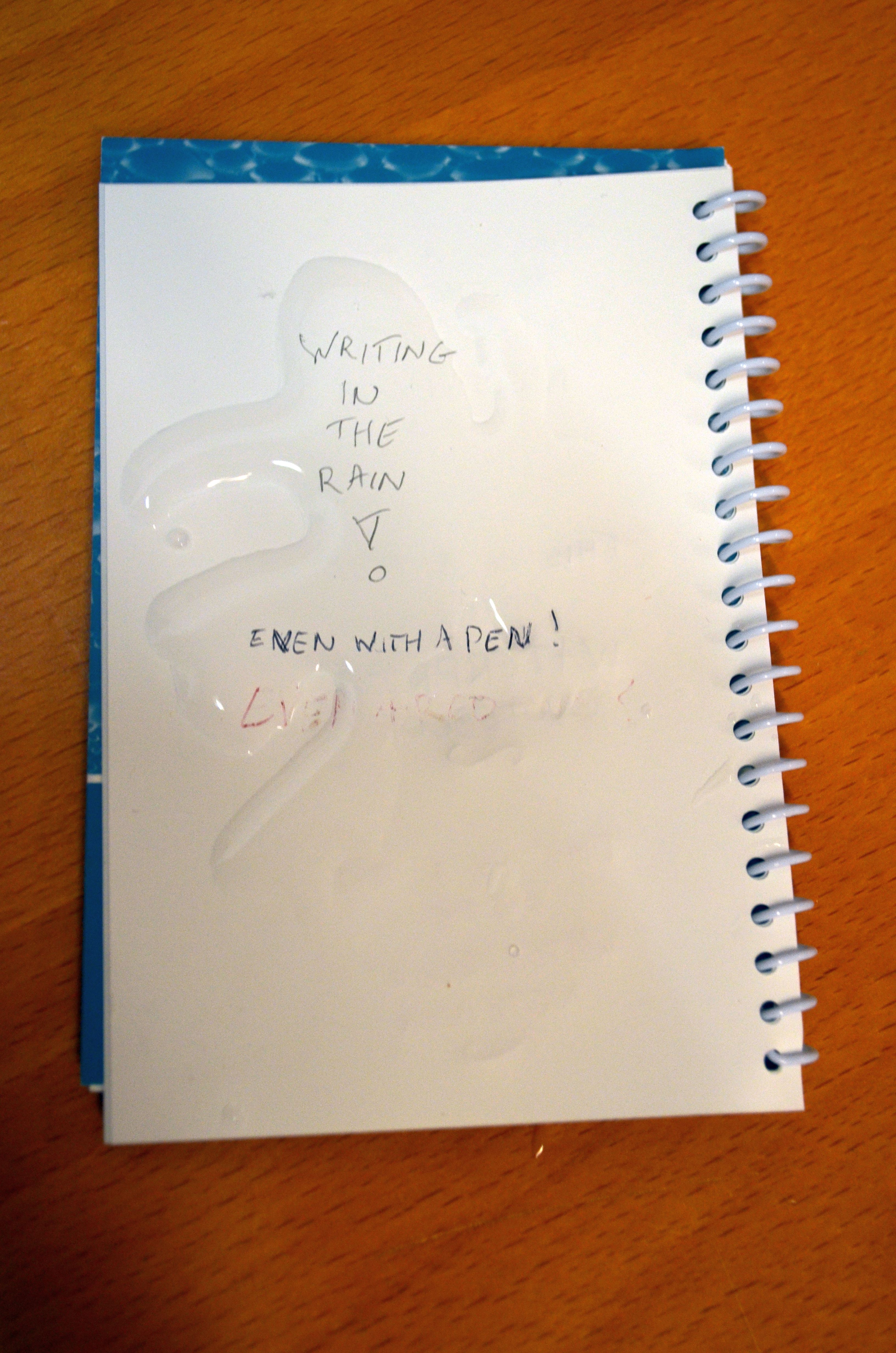 That’s already really cool for a notebook! But there is more that needs to be tested. We also need to be able to write in the rain, our work is not limited to reading. That was the next test: