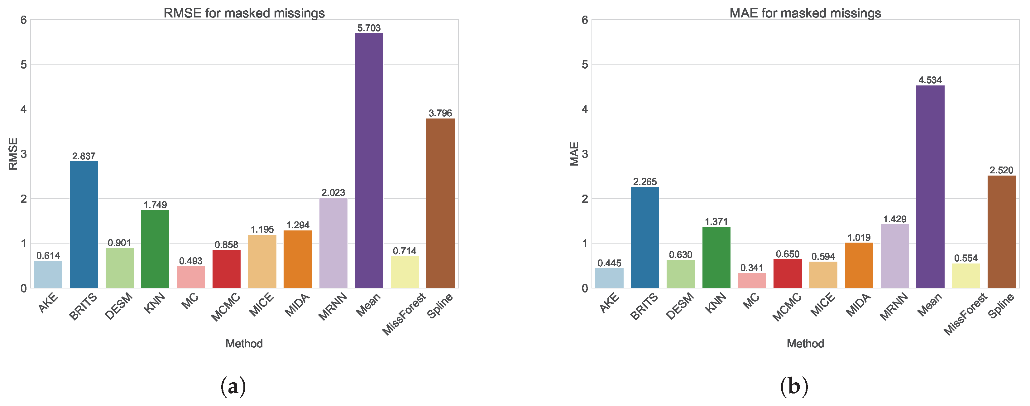 Methods evaluated included Spline Interpolation, MissForest, MICE, MCMC, M-RNN, BRITS, and others, and the performance of these imputation methods was evaluated for different proportions of missing data (ranging from 10% to 50%), as well as a realistic missing value scenario.