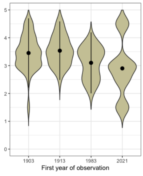 Our historical sources tell an entirely different story, however. Many ruderal species were already present and common during the creation of the Rallarvägen. Remarkably, there were even more non-native species back then than there are now, and we have observed a consistent decline since then. Even more surprisingly, this decline has led to the current ruderal community having fewer warm-adapted species than during the era of railroad construction. This implies that warm-adapted species are disappearing rather than emerging. This pattern holds true for both native and non-native ruderals.