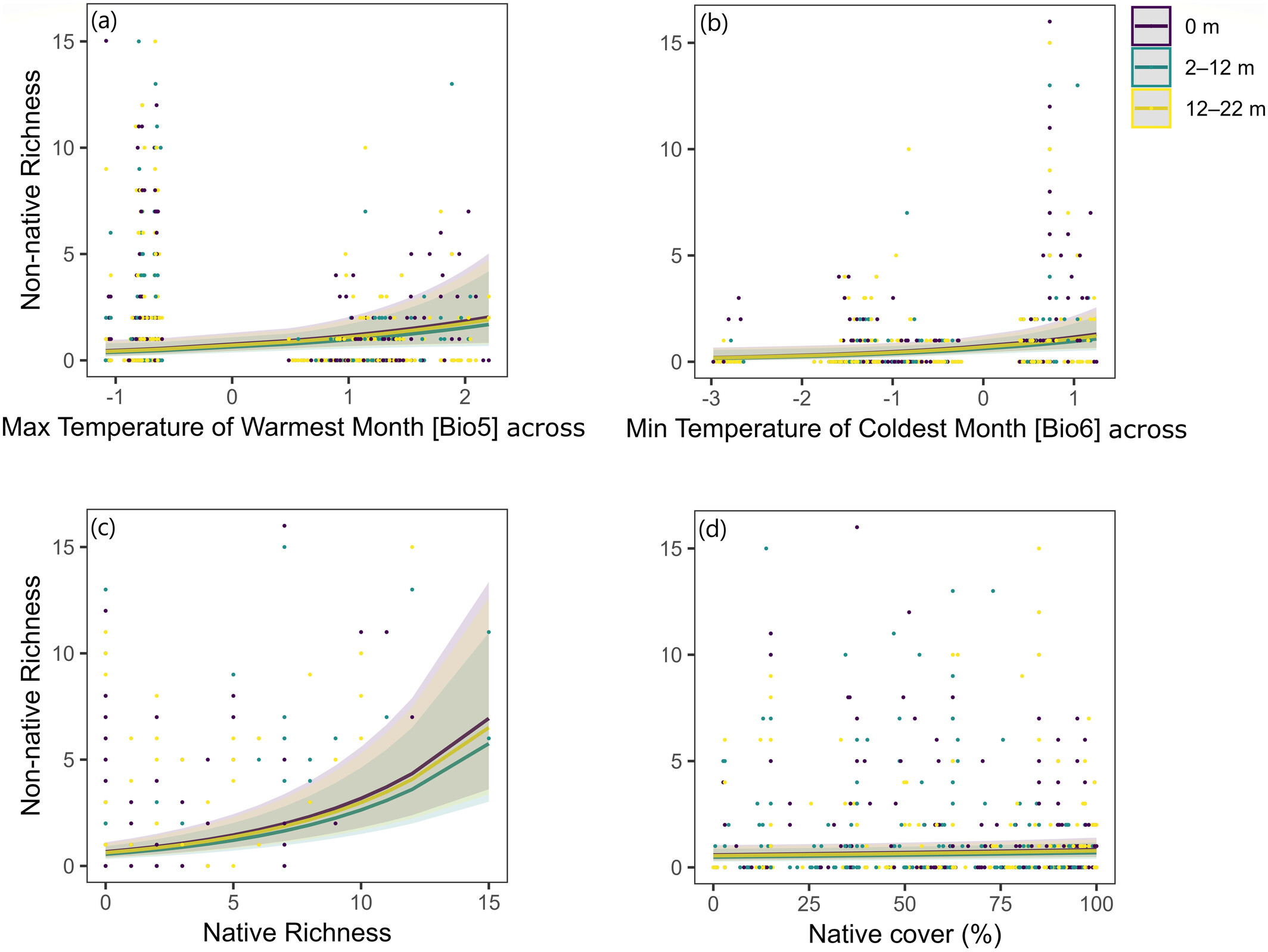 - Fewer non-natives at higher elevations and latitudes