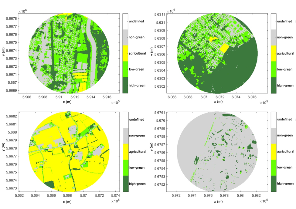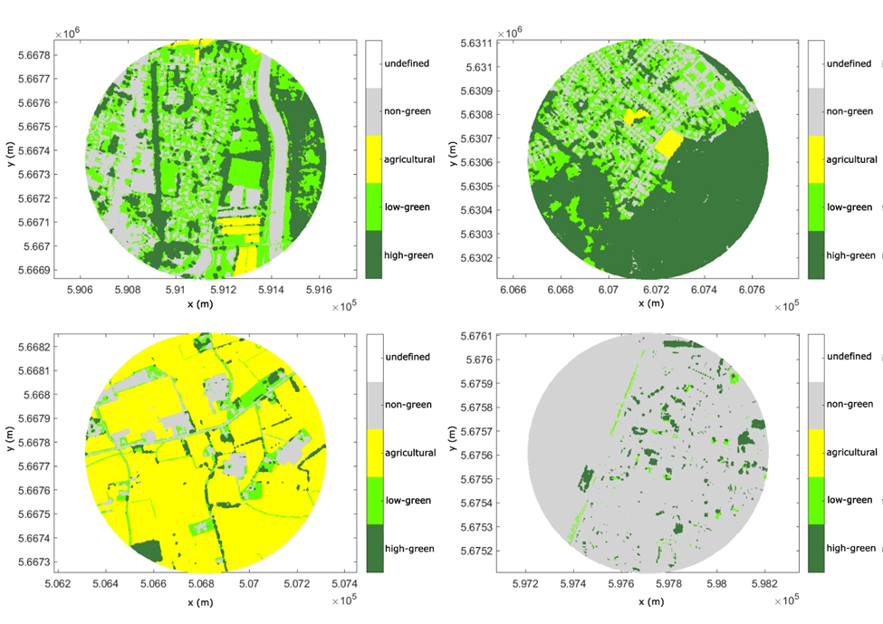 Examples of local land use around a measurement point, with either a high share of low greenery, high greenery, agricultural land and non-green surfaces. More green space in an area of 500 m around you results in a higher reporting of natural sounds. And more natural sounds results in a strongly improved soundscape experience.