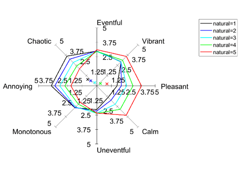 Impact of the amount of natural sounds one hears (from blue = nothing to red = a lot on the soundscape experience, showing a clear shift from annoying and chaotic to vibrant, pleasant and calm