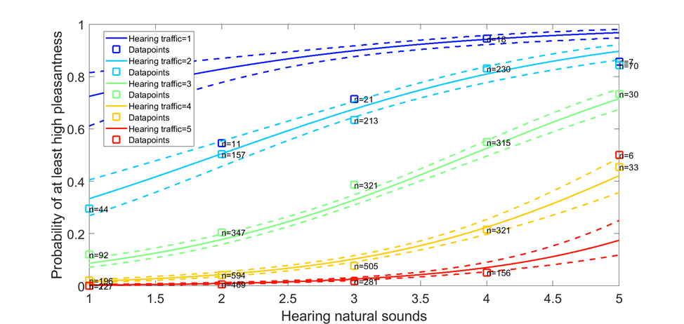 The probability of experiencing high pleasantness (y-axis) in your soundscape increased with the presence of natural sounds in it (x-axis). Of course, soundscapes were rated more pleasant when traffic noise was low (blue) than when it was high (red), but in all cases natural sounds resulted in an improvement.